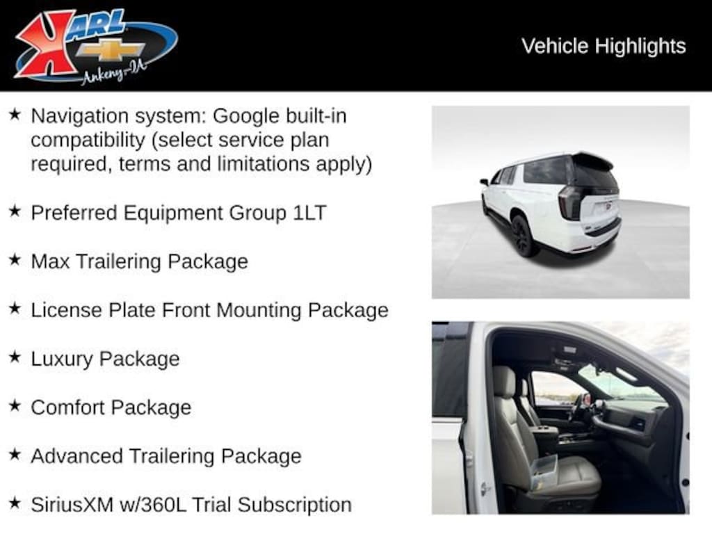 At Karl Chevrolet we want to help you find the best new or used car in Ankeny that suits your needs. Check out the 2025 Chevrolet Suburban For Sale in Ankeny, IA. When you buy a new car at Karl Chevrolet you know you're finding a vehicle you can rely on. We have a great selection of Platinum Quality Pre-Owned Vehicles. We also pride ourselves in creating a friendly atmosphere and reliable new car dealership that you can trust. Call us with any questions about our 2025 Chevrolet Suburban and our experts will be glad to help you! (515) 299-4300. *Equipment and options are generated by a 3rd party vendor, exact vehicle options may vary. Please see a salesperson for complete details and vehicle information.