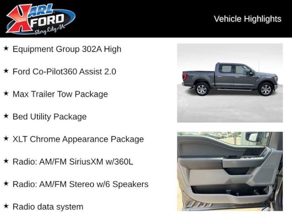 Your Dealer for Life, Karl Ford of Story City. When you buy a new car at Karl Ford of Story City you know you're finding a vehicle you can rely on. We have a great selection of new vehicles for you to test drive around Ames and Des Moines, IA. We also pride ourselves in creating a friendly atmosphere and reliable new car dealership that you can trust. Call us with any questions about our 2023 Ford F-150 and our experts will be glad to help you! (515) 733-4364. *Equipment and options are generated by a 3rd party vendor, exact vehicle options may vary. Please see a salesperson for complete details and vehicle information.