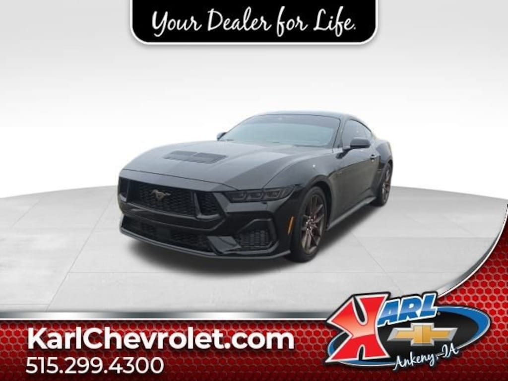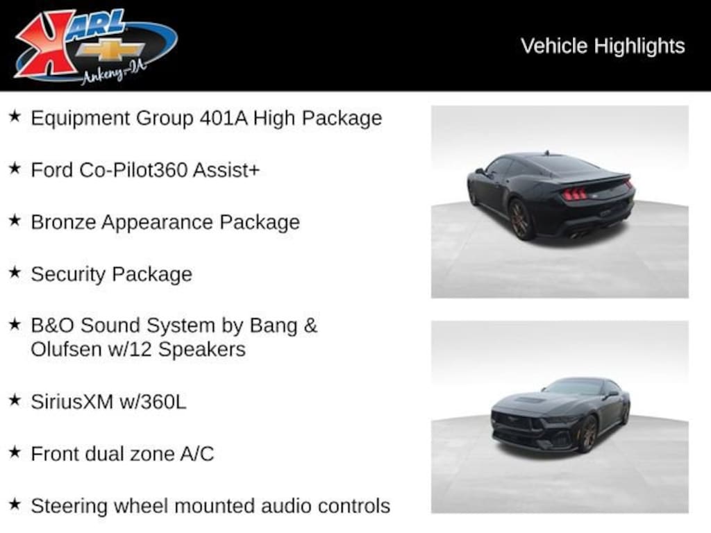Recent Arrival! Clean CARFAX. One Owner! Certified. Shadow Black 2025 Ford Mustang GT Premium GT PREMIUM FASTBACK 5.0L V8 Ti-VCT Active Anti-Theft System, Active Valve Performance Exhaust, Auto High-beam Headlights, B&O Sound System by Bang & Olufsen w/12 Speakers, Brembo Brake System w/Performance Linings, Bronze Appearance Package, Climate Controlled Heated/Cooled Front Seats, Connected Navigation, Driver Seat & Mirrors Memory, Equipment Group 401A High Package, Exterior Parking Camera Rear, Ford Co-Pilot360 Assist+, Front dual zone A/C, Illuminated Door-Sill Scuff Plates, Integrated Turn Signals, Internet access capable: FordPass Connect, Leather-Trimmed Bucket Seats w/Color Accents, Locking Center Console, Power driver seat, Pre-Collision Assist w/Automatic Emergency Braking, Rain sensing wipers, Rear Parking Sensors, Red Painted Brake Calipers w/White Logo, Remote keyless entry, Security Package, Sinister Bronze GT 5.0 & Pony Badges, SiriusXM w/360L, Sport steering wheel, Steering wheel mounted audio controls, Wheel Locking Kit. 16/24 City/Highway MPG 10-Speed Automatic RWDAt Karl Chevrolet we want to help you find the best new or used car in Ankeny that suits your needs. Check out the 2025 Ford Mustang For Sale in Ankeny, IA. When you buy a new car at Karl Chevrolet you know you're finding a vehicle you can rely on. We have a great selection of Platinum Quality Pre-Owned Vehicles. We also pride ourselves in creating a friendly atmosphere and reliable new car dealership that you can trust. Call us with any questions about our 2025 Ford Mustang and our experts will be glad to help you! (515) 299-4300. *Equipment and options are generated by a 3rd party vendor, exact vehicle options may vary. Please see a salesperson for complete details and vehicle information.Certification Program Details: Karl Chevrolet of Ankeny, The Nation's #1 CarBravo certified dealer, where platinum quality vehicles and unmatched benefits come together! This vehicle qualifies for our CarBravo Certified program reserved for the highest-quality pre-owned vehicles that are 10 model years or newer and have less than 100,000 miles. Every CarBravo Certified vehicle includes: ? Comprehensive 126-Point Inspection Professionally inspected by factory-trained technicians to meet strict mechanical, safety, and cosmetic standards. ? 6-Month / 6,000-Mile Bumper-to-Bumper Limited Warranty Enjoy added peace of mind with extensive coverage from the day you drive off the lot. ? 24/7 Roadside Assistance & Courtesy Transportation Flat tire? Dead battery? Need a tow? You're covered anywhere, anytime throughout the warranty period. ? Vehicle History & Title Guarantee Clean title, completed safety recalls, and a full CARFAX® or AutoCheck® report provided for complete transparency. ? 10-Day / 500-Mile Exchange Promise If you don't absolutely love it, bring it back and exchange it no hassle, no stress. Experience peace of mind and premium protection exclusively from Karl Chevrolet of Ankeny, the Nation's #1 CarBravo Certified Dealer!