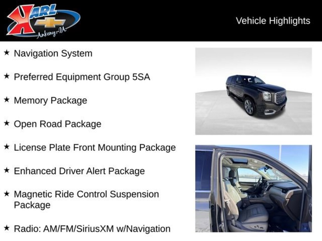 At Karl Chevrolet we want to help you find the best new or used car in Ankeny that suits your needs. Check out the 2020 GMC Yukon XL For Sale in Ankeny, IA. When you buy a new car at Karl Chevrolet you know you're finding a vehicle you can rely on. We have a great selection of Platinum Quality Pre-Owned Vehicles. We also pride ourselves in creating a friendly atmosphere and reliable new car dealership that you can trust. Call us with any questions about our 2020 GMC Yukon XL and our experts will be glad to help you! (515) 299-4300. *Equipment and options are generated by a 3rd party vendor, exact vehicle options may vary. Please see a salesperson for complete details and vehicle information.