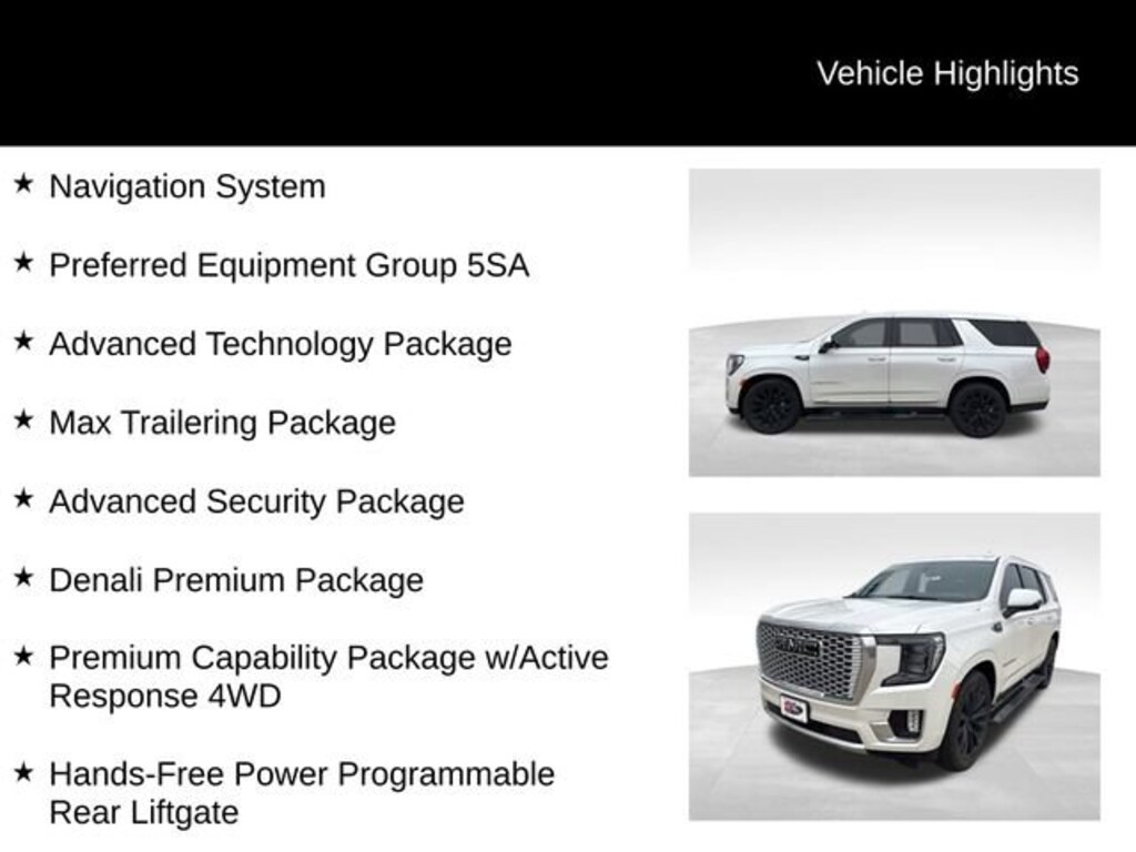 Certified.White Frost Denali 4WD EcoTec3 6.2L V815 Diagonal Multi-Color Head-Up Display, 2 Presets For Outside Rearview Mirrors, 3 Years of GMC Connected Services, 3rd Row 60/40 Power-Folding Split-Bench Seat, Adaptive Cruise Control, Advanced Security Package, Advanced Technology Package, Air Ride Adaptive Suspension, Automatic Stop/Start, Bright Front & Rear Door Sill Plates, Chrome Door Handles w/Body-Color Strip, Denali Premium Package, Dual Exhaust System, Dual-Pane Panoramic Power Sunroof, Electronic Limited Slip Differential (eLSD), Enhanced Automatic Emergency Braking, Floor Console, Galvano Bodyside Moldings, Glass Breakage Sensor, Hands-Free Power Programmable Rear Liftgate, HD Surround Vision, Heated & Ventilated Driver & Front Passenger Seats, Heated 2nd Row Outboard Position Seats, Heated Driver & Front Passenger Seats, Heated Steering Wheel, Hill Descent Control, Inside Rear-View Auto-Dimming Mirror, Inside Rearview Auto-Dimming Rear Camera Mirror, Max Trailering Package, Navigation System, Outside Heated Power-Adjustable Mirrors, Power Release 2nd Row Bucket Seats, Power Tilt & Telescopic Steering Column, Power-Retractable Assist Steps, Preferred Equipment Group 5SA, Premium Capability Package w/Active Response 4WD, Rear Camera Mirror Washer, Rear Pedestrian Alert, Reverse Automatic Braking, Safety Alert Seat, Start/Stop System Disable Button, Theft-Deterrent Alarm System, Universal Home Remote, Vehicle Inclination Sensor, Vehicle Interior Movement Sensor, Wireless Charging.Here at Karl Chevrolet of Stuart we want to help you find the best vehicle to suit your needs. With our huge selection of new and pre-owned vehicles, we're sure to have the right car for you! We pride ourselves on creating a friendly buying experience and earning the title of Your Dealer for Life. Give us a call at 515.523.1201 and speak to our experts to find out just how easy it is to get the vehicle of your dreams!*Equipment and options are generated by a 3rd party vendor, exact vehicle options may vary. Please see a salesperson for complete details and vehicle information.CARFAX One-Owner.Certification Program Details: Karl Chevrolet of Stuart, your newest CarBravo dealer, where platinum quality vehicles and unmatched benefits come together! -Comprehensive Limited Bumper to Bumper Warranty. -24/7 Roadside Assistance: -Multi-Point Vehicle Inspection: Every vehicle undergoes a Platinum Quality Certified Inspection known throughout the industry to ensure top quality. -Vehicle Exchange Program. Within 10-Days and 500 miles -Complimentary Vehicle History Report -Nationwide Dealer Network Support: Enjoy the backing of the extensive CarBravo and GM dealership network. -OnStar and SiriusXM Trials: Enjoy connected services and entertainment with included trial subscriptions. -Terms and conditions may apply. With every vehicle purchased, you'll enjoy the peace of mind that comes with a limited warranty, 24/7 roadside assistance, and a comprehensive vehicle inspection.