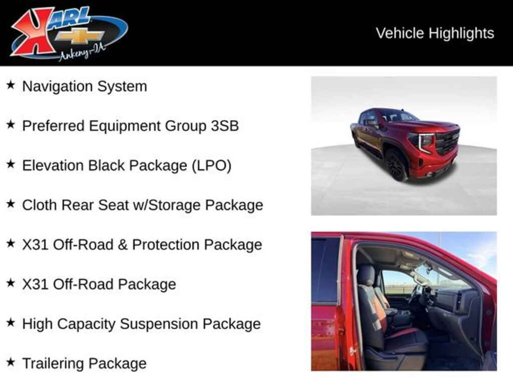 Recent Arrival! CARFAX One-Owner & Local Trade! Equipped With Running Boards, Tonneau Cover & Bed Liner! Clean CARFAX. Certified. Volcanic Red Tintcoat 2024 GMC Sierra 1500 Elevation 4WD CREW CAB 147 EL EcoTec3 5.3L V8 10-Speed Automatic, 4WD, Black Cloth, 10-Way Power Driver Seat Adjuster w/Lumbar, 2 Charge/Data USB Ports, 6-Speaker Audio System Feature, 6 Rectangular Black Tubular Assist Steps (LPO), All-Weather Floor Liner (LPO), Apple CarPlay/Android Auto, Auto High-beam Headlights, Auto-Locking Rear Differential, Black GMC Emblems (LPO), Body Color Header w/Gloss Black Mesh Grille Bars, Cloth Rear Seat w/Storage Package, Color-Keyed Carpeting Floor Covering, Deep-Tinted Glass, Dual Exhaust System, Electric Rear-Window Defogger, Elevation Black Package (LPO), Forward Collision Alert, Front dual zone A/C, Front Frame-Mounted Black Recovery Hooks, Front Rubberized-Vinyl Floor Mats, GMC Connected Access Capable, HD Rear Vision Camera, Heated Driver & Front Outboard Passenger Seating, Heated steering wheel, Heavy-Duty Air Filter, High Capacity Suspension Package, Hill Descent Control, Hitch Guidance, Keyless Open & Start, Lane Keep Assist w/Lane Departure Warning, LED Cargo Area Lighting, Manual Tilt-Wheel & Telescoping Steering Column, Navigation System, Off-Road Suspension, OnStar & GMC Connected Services Capable, Power Door Locks, Power windows, Preferred Equipment Group 3SB, Push Button Start, Rear Rubberized-Vinyl Floor Mats, Rear Wheelhouse Liners, Remote Vehicle Starter System, SiriusXM w/360L, Steering Wheel Audio Controls, Theft Deterrent System (Unauthorized Entry), Trailering Package, Wheels: 20 x 9 High Gloss Black Painted Aluminum, Wi-Fi Hotspot Capable, Wireless Apple CarPlay/Wireless Android Auto, X31 Hard Badge, X31 Off-Road & Protection Package, X31 Off-Road Package. 15/19 City/Highway MPG 10-Speed Automatic 4WDAt Karl Chevrolet we want to help you find the best new or used car in Ankeny that suits your needs. Check out the 2024 GMC Sierra 1500 For Sale in Ankeny, IA. When you buy a new car at Karl Chevrolet you know you're finding a vehicle you can rely on. We have a great selection of Platinum Quality Pre-Owned Vehicles. We also pride ourselves in creating a friendly atmosphere and reliable new car dealership that you can trust. Call us with any questions about our 2024 GMC Sierra 1500 and our experts will be glad to help you! (515) 299-4300. *Equipment and options are generated by a 3rd party vendor, exact vehicle options may vary. Please see a salesperson for complete details and vehicle information.Certification Program Details: Karl Chevrolet of Ankeny, The Nation's #1 CarBravo certified dealer, where platinum quality vehicles and unmatched benefits come together! This vehicle qualifies for our CarBravo Certified program reserved for the highest-quality pre-owned vehicles that are 10 model years or newer and have less than 100,000 miles. Every CarBravo Certified vehicle includes: ? Comprehensive 126-Point Inspection Professionally inspected by factory-trained technicians to meet strict mechanical, safety, and cosmetic standards. ? 6-Month / 6,000-Mile Bumper-to-Bumper Limited Warranty Enjoy added peace of mind with extensive coverage from the day you drive off the lot. ? 24/7 Roadside Assistance & Courtesy Transportation Flat tire? Dead battery? Need a tow? You're covered anywhere, anytime throughout the warranty period. ? Vehicle History & Title Guarantee Clean title, completed safety recalls, and a full CARFAX® or AutoCheck® report provided for complete transparency. ? 10-Day / 500-Mile Exchange Promise If you don't absolutely love it, bring it back and exchange it no hassle, no stress. Experience peace of mind and premium protection exclusively from Karl Chevrolet of Ankeny, the Nation's #1 CarBravo Certified Deale