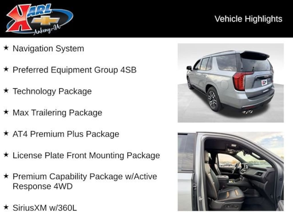 Recent Arrival! CARFAX One-Owner! Certified. Sterling Metallic 2024 GMC Yukon AT4 4WD 4DR AT4 EcoTec3 6.2L V8 4WD, 12-Way Power Seat Adjusters, 15 Diagonal Multi-Color Head-Up Display, 2 Presets For Outside Rearview Mirrors, 3rd Row 60/40 Power-Folding Split-Bench Seat, Air Ride Adaptive Suspension, Apple CarPlay/Android Auto, AT4 Premium Plus Package, Auto High-beam Headlights, Black Roof-Mounted Luggage Rack Side Rails, Bose 9-Speaker Stereo Audio System Feature, Bright Front & Rear Door Sill Plates, Dual-Pane Panoramic Power Sunroof, Electronic Limited Slip Differential (eLSD), Extra Capacity Cooling System, Forward Collision Alert, Front & Rear Park Assist, Front dual zone A/C, Front High-Approach Angle Fascia, Hands-Free Power Programmable Rear Liftgate, HD Surround Vision, Heated 2nd Row Outboard Position Seats, Heated Steering Wheel, Heavy-Duty Air Filter, Hill Descent Control, Hitch View, Inside Rear-View Auto-Dimming Mirror, Integrated Trailer Brake Controller, Lane Change Alert w/Side Blind Zone Alert, Lane Keep Assist w/Lane Departure Warning, License Plate Front Mounting Package, Max Trailering Package, Memory seat, Navigation System, Outside Heated Power-Adjustable Mirrors, Perforated Heated & Ventilated Dr & Frt Pass Seats, Power driver seat, Power Tilt & Telescopic Steering Column, Power-Retractable Assist Steps, Preferred Equipment Group 4SB, Premium Capability Package w/Active Response 4WD, Rain sensing wipers, Rear air conditioning, Rear Pedestrian Alert, Rear Seat Media System, Red Horizontal-Mounted Recovery Hooks, Safety Alert Seat, SiriusXM w/360L, Smart Trailer Integration Indicator, Steering wheel mounted audio controls, Technology Package, Trailer Side Blind Zone Alert, Universal Home Remote, Wheels: 20 x 9 6-Spoke Machined Aluminum, Wireless Charging. 14/18 City/Highway MPG 10-Speed Automatic with Overdrive 4WD