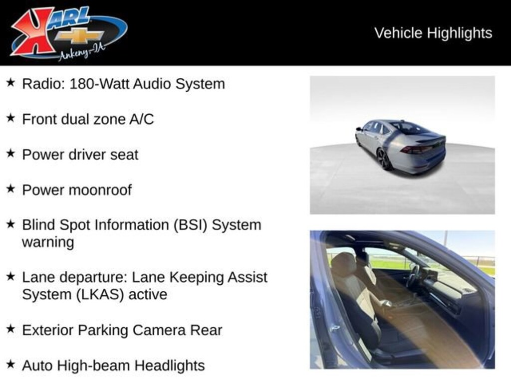 Certification Program Details: Karl Chevrolet of Ankeny, The Nation's #1 CarBravo Certified Dealer! Every CarBravo Certified vehicle includes: Comprehensive 126-Point Inspection Professionally inspected by factory-trained technicians to meet strict mechanical, safety, and cosmetic standards. 12-Month / 12,000-Mile Bumper-to-Bumper Limited Warranty Enjoy added peace of mind with extensive coverage from the day you drive off the lot. 24/7 Roadside Assistance & Courtesy Transportation Flat tire? Dead battery? Need a tow? You're covered anywhere, anytime throughout the warranty period. Vehicle History & Title Guarantee Clean title, completed safety recalls, and a full CARFAX® or AutoCheck® report provided for complete transparency. 10-Day / 500-Mile Exchange Promise If you don't absolutely love it, bring it back and exchange it no hassle, no stress. Experience peace of mind and premium protection exclusively from Karl Chevrolet of Ankeny, the Nation's #1 CarBravo Dealer!- Urban Gray Pearl- Gray- Radio: 180-Watt Audio System- Front dual zone A/C- Power driver seat- Blind Spot Information (BSI) System warning- Lane Keeping Assist System (LKAS) active- Auto High-beam Headlights- Apple CarPlay/Android Auto- Exterior Parking Camera Rear- Power moonroof- Wheels: 19 x 8.5J Berlina BlackThis 2024 Honda Accord Hybrid Sport SPORT SEDAN is the perfect blend of style, efficiency, and advanced technology. With its sleek Gray exterior and spacious, well-appointed interior, this Accord Hybrid is sure to turn heads and provide a premium driving experience.Under the hood, the 2.0L 16V DOHC eCVT engine delivers an impressive 46 MPG in the city and 41 MPG on the highway, making it an exceptional choice for the eco-conscious driver. The advanced hybrid powertrain seamlessly combines electric and gasoline power, providing a smooth and responsive ride.Inside, you'll find a wealth of premium features, including a 180-Watt Audio System, dual-zone automatic climate control, and a power driver's seat. The Blind Spot Information System and Lane Keeping Assist System provide added peace of mind, while the Apple CarPlay and Android Auto integration keep you connected on the go.This Accord Hybrid is also backed by the industry-leading Karl Chevrolet CarBravo Certified program, which includes a comprehensive 126-point inspection, a 12-month/12,000-mile bumper-to-bumper warranty, and 24/7 roadside assistance. You can drive with confidence, knowing that this vehicle has been thoroughly inspected and is ready to provide years of reliable service.Don't miss your chance to experience the exceptional value and premium features of this 2024 Honda Accord Hybrid Sport SPORT SEDAN. Visit our showroom today and let our knowledgeable team help you discover why this vehicle is the perfect choice for your next adventure.At Karl Chevrolet we want to help you find the best new or used car in Ankeny that suits your needs. When you buy a new car at Karl Chevrolet you know you're finding a vehicle you can rely on. We have a great selection of Platinum Quality Pre-Owned Vehicles. We also pride ourselves in creating a friendly atmosphere and a reliable Dealership that you can trust. Call us and our experts will be glad to help you! (515) 299-4300. *Equipment and options are generated by a 3rd party vendor, exact vehicle options may vary. Please see a salesperson for complete details and vehicle information.