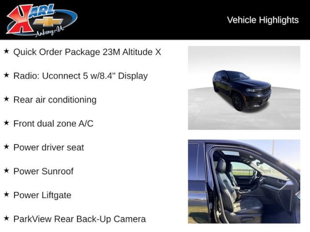 The Altitude X package elevates the Grand Cherokee L's style with a bold, blacked-out exterior treatment, including Gloss Black accents and 18-inch fully painted aluminum wheels. Inside, the cabin is equally impressive, with a Black headliner, Heated Steering Wheel, and Heated Front Seats providing a touch of luxury and comfort.