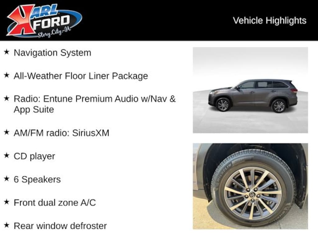 Your Dealer for Life, Karl Ford of Story City. When you buy a new car at Karl Ford of Story City you know you're finding a vehicle you can rely on. We have a great selection of new vehicles for you to test drive around Ames and Des Moines, IA. We also pride ourselves in creating a friendly atmosphere and reliable new car dealership that you can trust. Call us with any questions about our 2018 Toyota Highlander and our experts will be glad to help you! (515) 733-4364. *Equipment and options are generated by a 3rd party vendor, exact vehicle options may vary. Please see a salesperson for complete details and vehicle information.